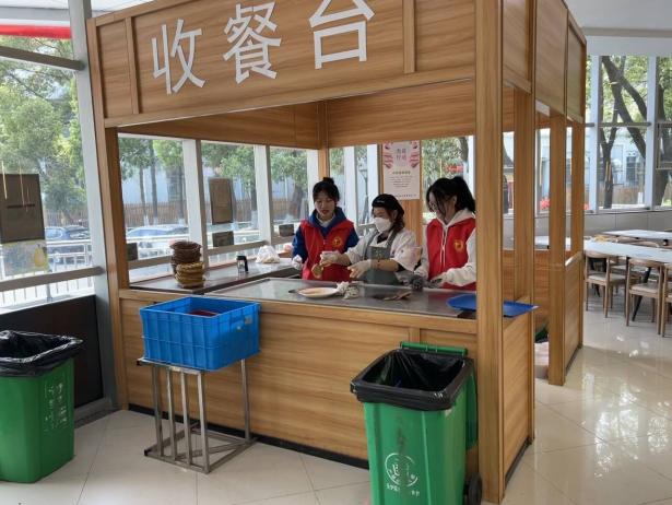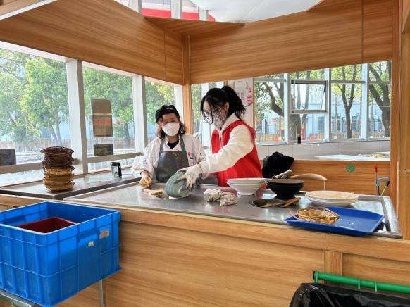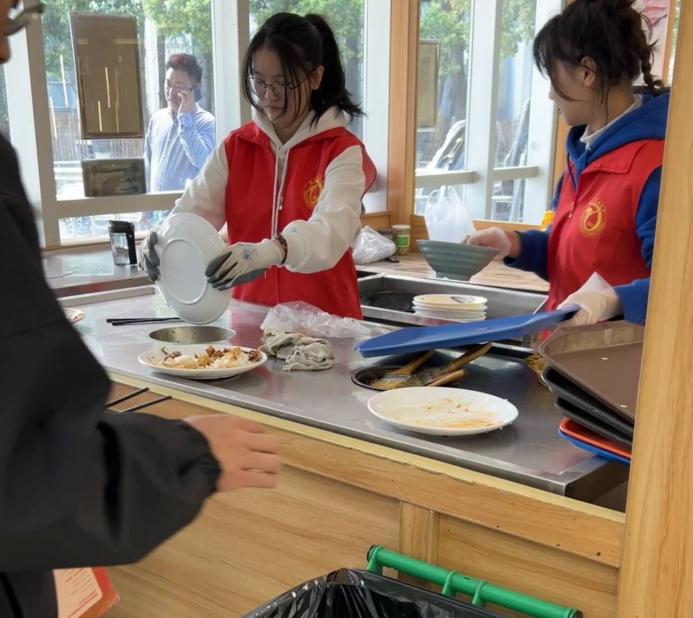 孙宇晴、周慧两位同学看着食堂阿姨熟练娴熟地将餐盘中剩菜剩饭、筷子、纸巾等垃圾分类清理好,心里很是佩服。面对一波又一波员工送来的餐盘,她们显得有点手忙脚乱,和食堂阿姨的从容麻利形成鲜明对比。1小时的换岗体验让她们深深感受到了食堂阿姨的辛苦和不易,也更加意识到节约粮食的重要性。