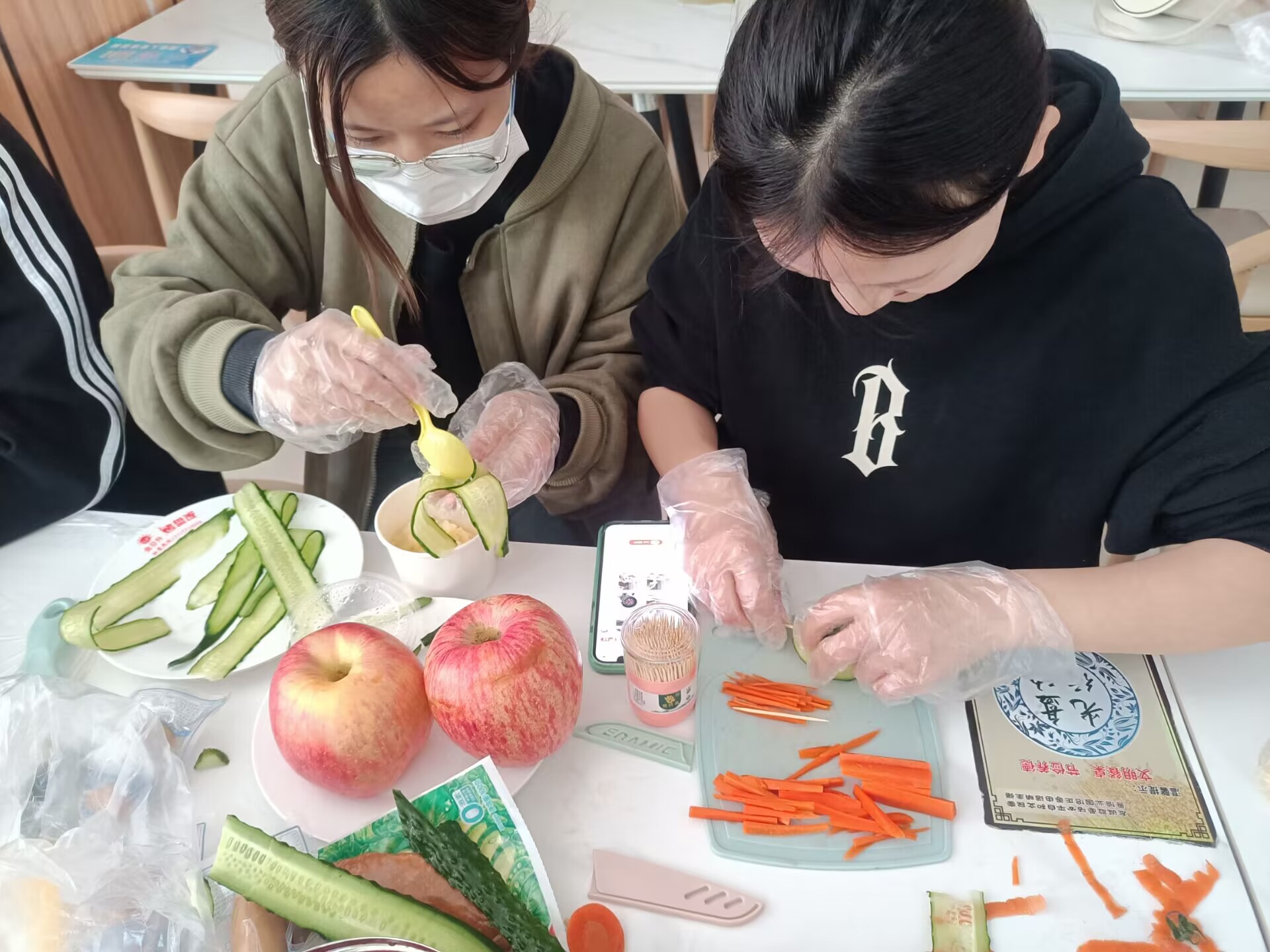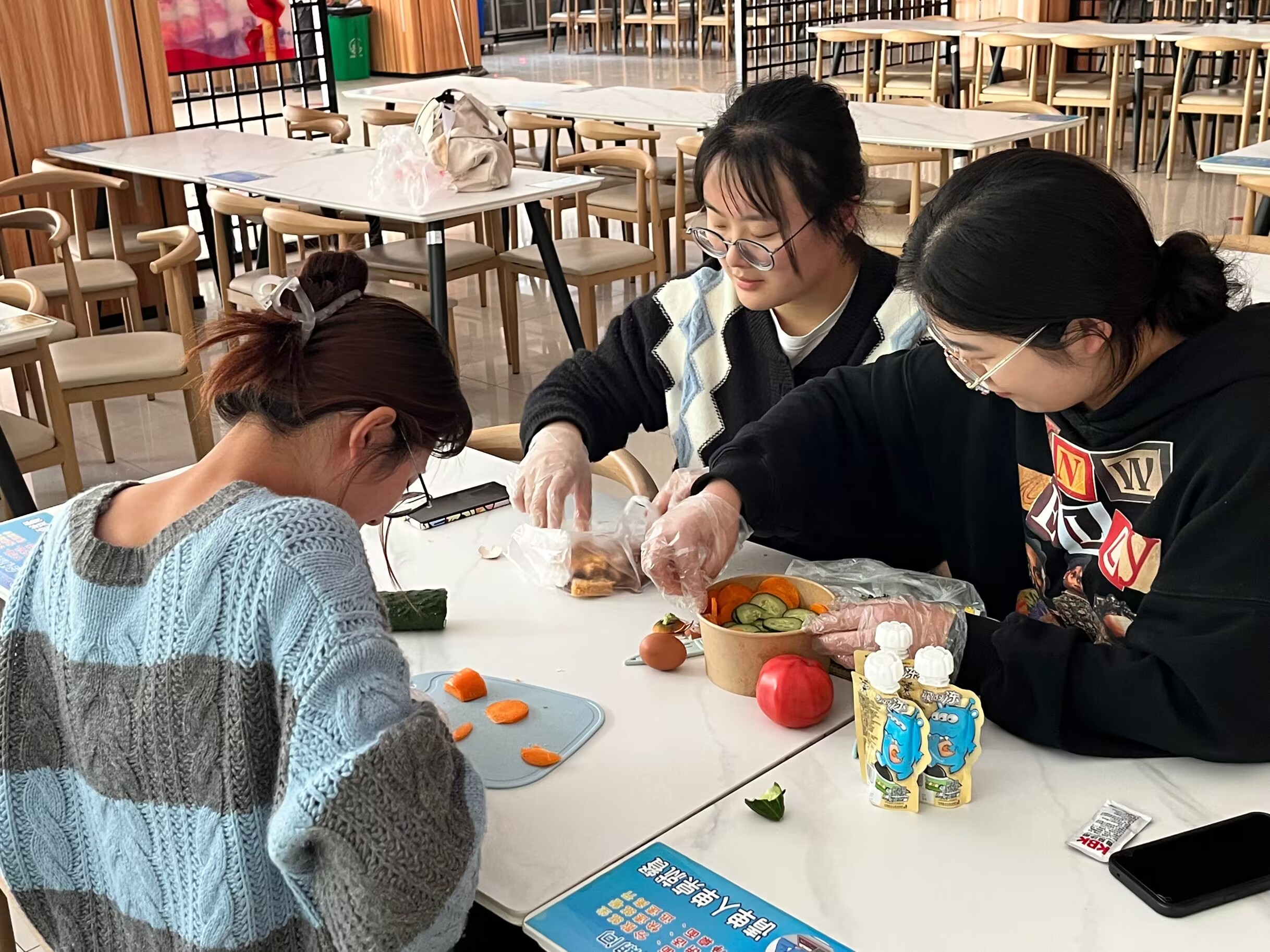 “520”这天早上,在3名员工预备党员的组织下,食品专业的员工们自备食材、器具,早早来到食堂一楼,兴致勃勃地准备为全校师生们送上“520”的营养低脂第一餐。制作之前,同学们都带上了一次性手套,女同学们则自觉主动地扎起了头发,以确保食品安全卫生。清洗完食材之后,大家对照“轻食谱”,纷纷迫不及待地投入创作之中。只见有的同学在桌上先铺了一层保鲜膜,然后专心致志地切着胡萝卜和黄瓜,切好后将食材一层一层地铺在面包片上,并适当地挤入了沙拉酱;有的同学用小刀小心翼翼地将鸡蛋、圣女果切出花型,将煮熟的鸡胸肉撕成鸡丝,然后将食材摆盘,再撒入一点黑胡椒粉挤上少许青柠汁搅拌均匀;有的同学将蒸好的土豆压成土豆泥,将黄瓜片卷成椭圆形模子,然后用小勺子挖入适量土豆泥放入黄瓜片卷中压紧压实.....土豆泥寿司、果蔬沙拉、草莓燕麦酸奶、一口时蔬饭团等一份份直击味蕾的低卡减脂餐在同学们的创意制作中精彩呈现,很快便被来食堂就餐的师生一抢而空,师生们对这份“520”的暖心礼物很是满意,纷纷称赞。