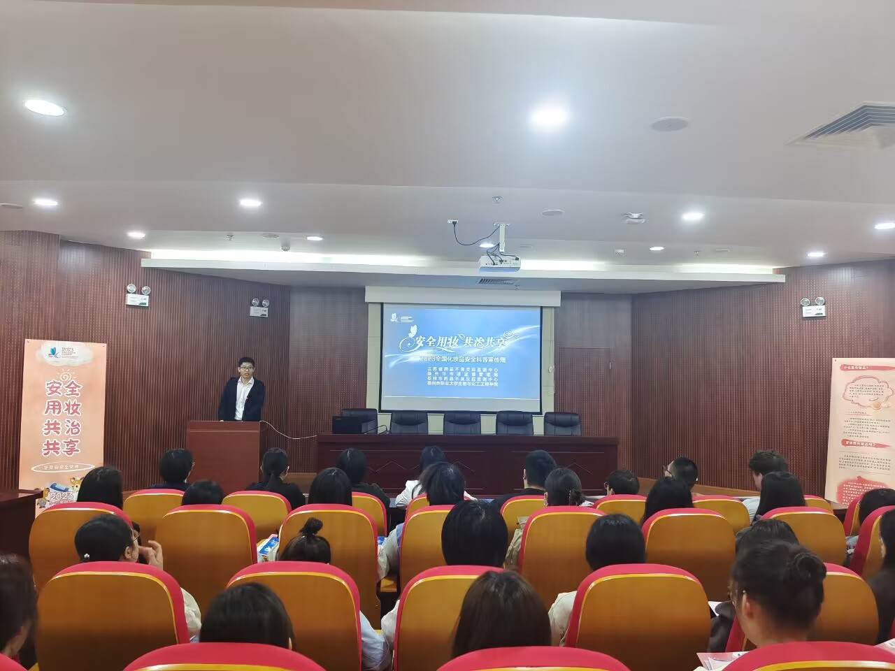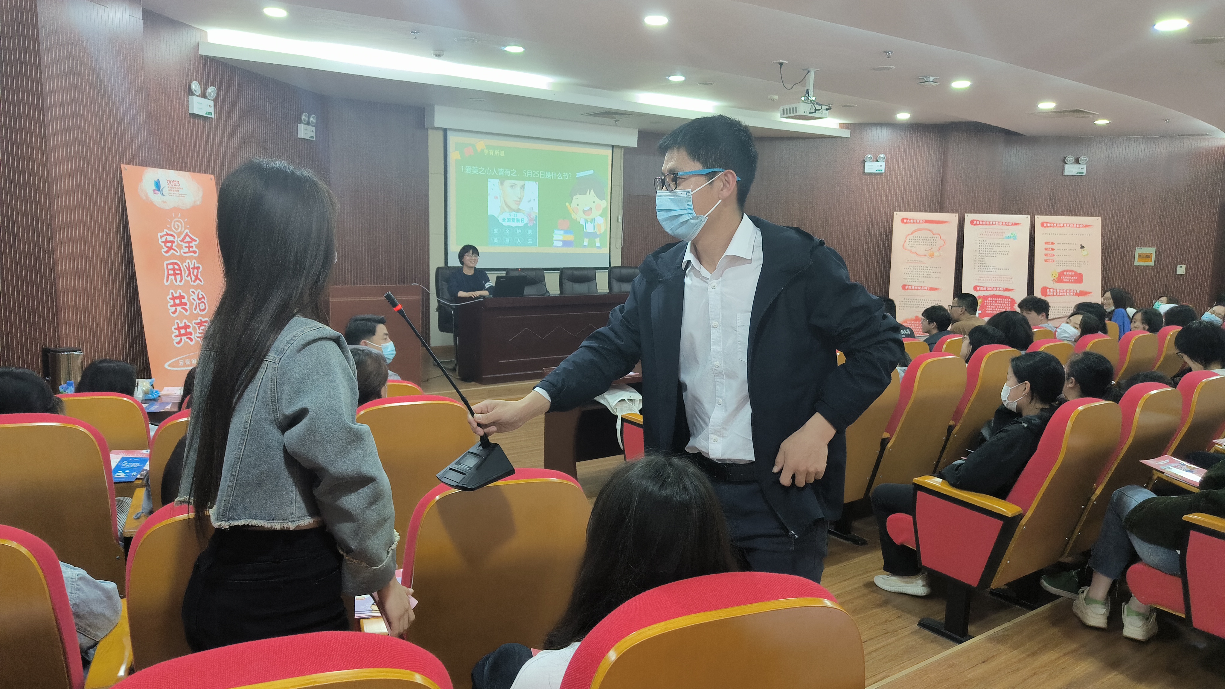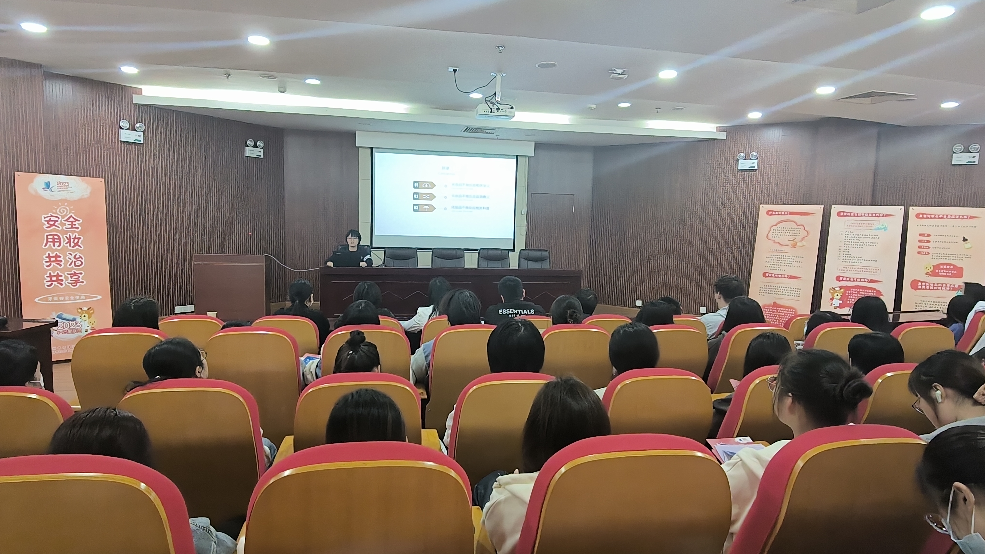5月25日简称“我爱我”,是全国“爱肤日”。为向广大青年员工宣传安全用妆、健康护肤知识,公司联合省市药监局邀请了苏北人民医院赵莎医生、市药品不良反应监测中心杨婷婷两位专家进行宣讲、答疑,2位专家结合科普视频动画,为师生们介绍了化妆品定义、牙膏基本常识、不良反应判断和处理、化妆品正确选购等知识。