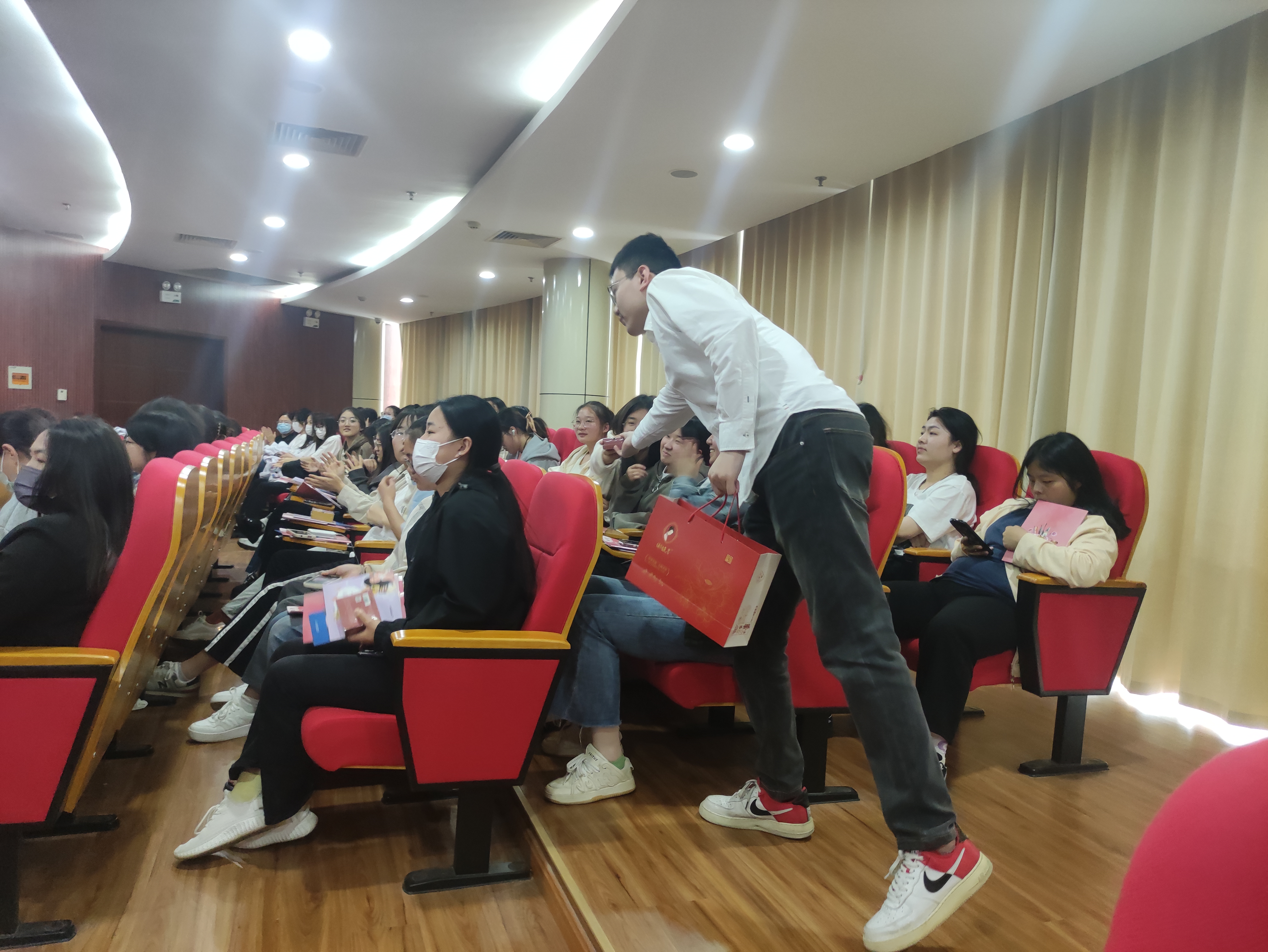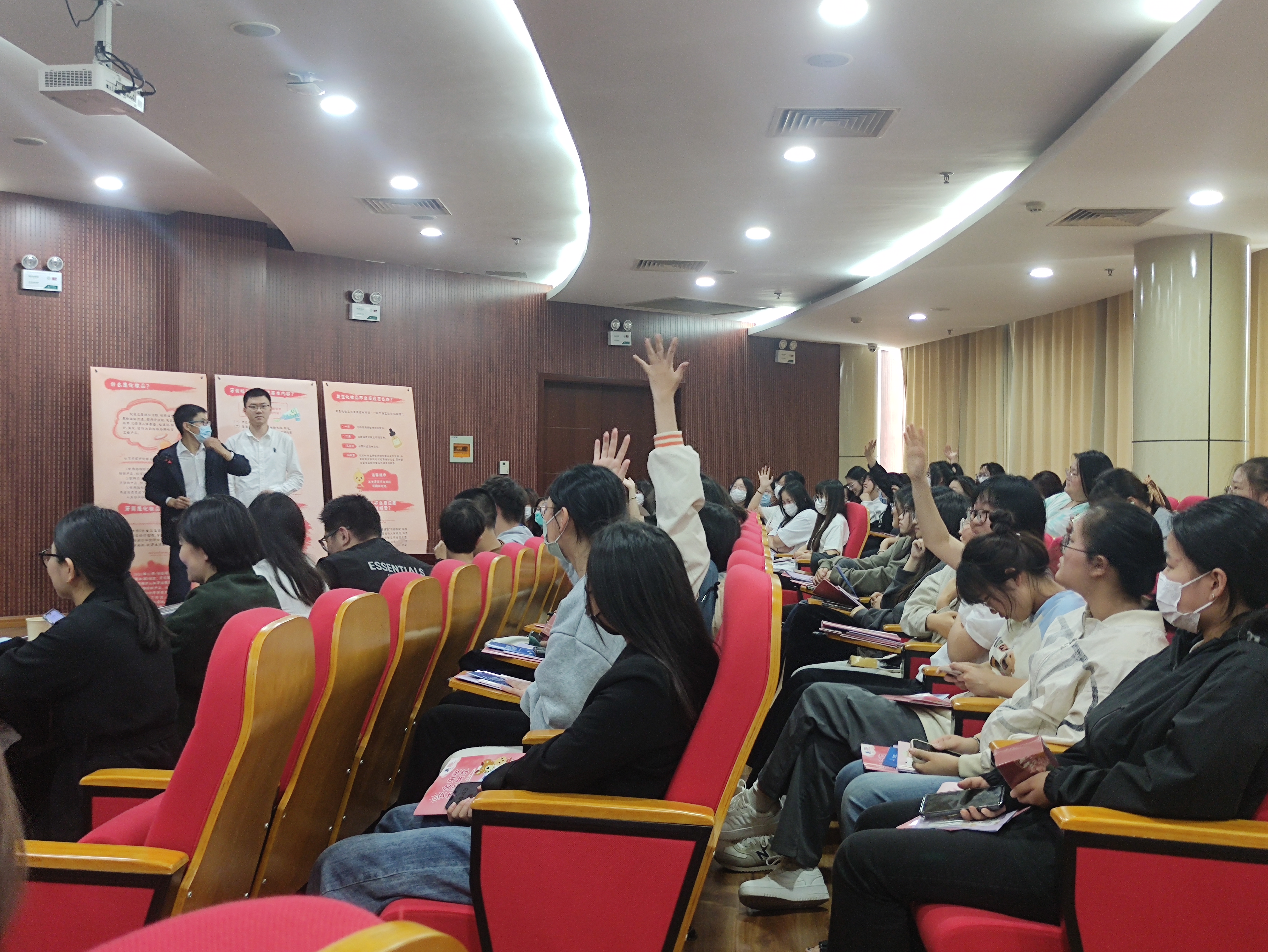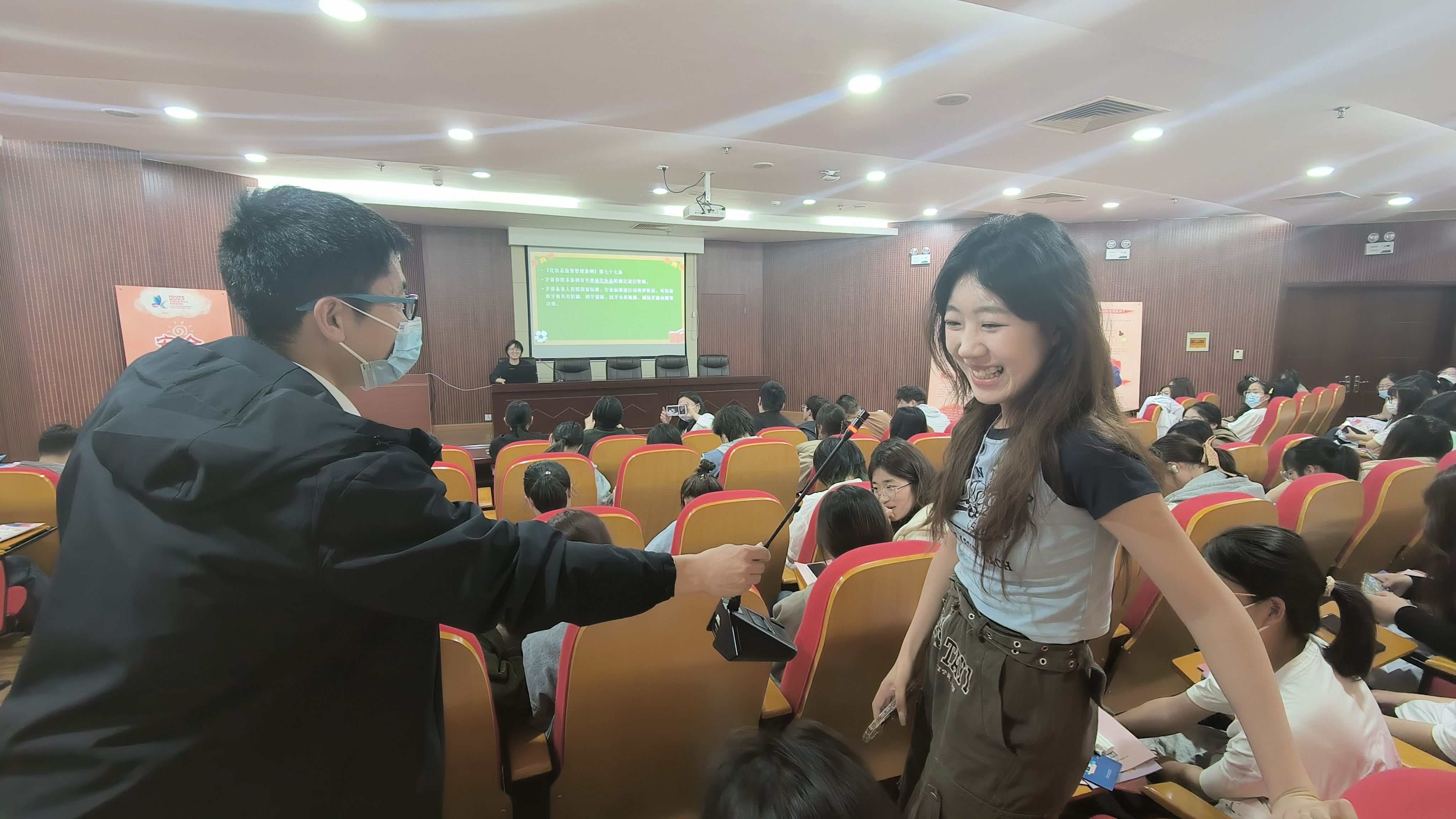 “近水楼台先得月”,讲座现场的不少同学遇到了诸如青春痘、敏感肌、草莓鼻等护肤困惑,他们积极踊跃地向现场专家咨询,进一步掌握了安全护肤相关的秘密和诀窍。讲座现场互动气氛热烈,达到了良好的宣传效果。“这次科普讲座打破了我对护肤知识存在的很多误区,又实用又有趣!”食品2203班吴霜同学拿着有奖答题的小礼品开心地说到。